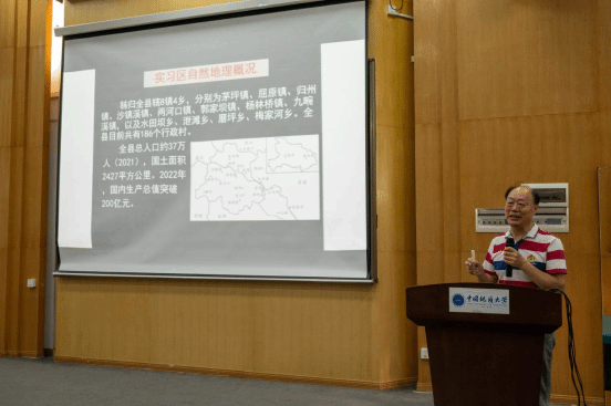秭归实习队学术指导冯庆来首先从基地的地理位置、自然概况以及管理模式展开,帮助同学们对秭归实习基地有了大致的了解。随后他着重介绍了秭归实习基地的教学定位与翻转课堂的特色教学模式,并对实习工作提出了具体要求。